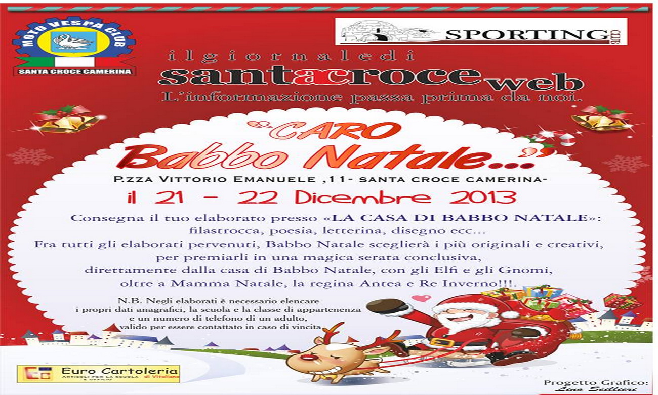 Anche a Santa Croce Camerina Babbo Natale ha la sua casa: al civico numero 11 di piazza Vittorio Emanuele, nei giorni 21, 22, 28 e 29 dicembre sarà possibile, a partire dalle ore 17 con ingresso a piccoli gruppi, una visita guidata al laboratorio attivo animato da elfi e folletti, da mamma Natale e la sua cucina dove realizza manicaretti deliziosi per gli elfi e gli gnomi del bosco, dalla regina Antea e Re Inverno, con la partecipazione straordinaria di “Roberto il postino”. Quest’ultimo per l’occasione si trasferirà dall’Ufficio Postale del paese a quello di Babbo Natale, per ricevere le richieste di chi, tra genitori, nonni e zii premurosi, vuole stupire i più piccini attraverso una consegna a domicilio dei doni di Natale, con la collaborazione dei commercianti che, a vario titolo, prenderanno spontaneamente parte all’iniziativa. Per questa magica occasione la redazione di Santa Croce Web bandisce il concorso “Caro Babbo Natale…” rivolto ai bambini delle scuole materne e primarie che nei giorni sopraindicati si recheranno in visita presso la casa e consegneranno nell’apposita cassetta già predisposta all’interno dei locali, una letterina, una poesia, una filastrocca o un disegno, ognuno identificabile attraverso i propri dati anagrafici, la scuola e la classe di appartenenza e un numero di cellulare di un adulto contattabile in caso di vincita; tra tutti gli elaborati pervenuti all’ufficio postale all’interno della sua Casa, Babbo Natale sceglierà i più creativi e originali che saranno premiati in una serata di festa curata da Santa Croce Web per la sponsorizzazione ufficiale di Eurocartoleria di Vitaliano Pollari. A tal proposito la nostra redazione realizzerà uno speciale, a partire dai prossimi giorni, per farvi realmente partecipi della realizzazione di questo progetto ideato e curato dalle associazioni Moto Vespa Club e Sporting Club Santa Croce Camerina per la regia di Pino Zisa. Ogni anno, tutti i bambini attendono con impazienza che arrivi Babbo Natale, questa ci sembra una occasione davvero insolita e magica per fare vivere ai più piccoli grandi emozioni.