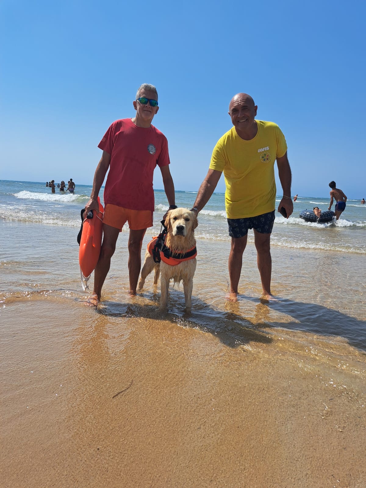 Tra questi visitatori c’è una persona speciale che, da diversi anni, arriva come turista ma si trasforma in volontario per il Comune di Santa Croce Camerina: Roberto Brullo, soccorritore acquatico della SNS di Genova, sezione di Pavia. Roberto è anche istruttore e formatore di bagnini, oltre che istruttore cinofilo di soccorso acquatico. Lo si riconosce subito, con la sua maglietta rossa da bagnino, sempre accompagnato dal suo compagno a quattro zampe: Scott, un giovane golden retriever americano di 9 mesi che già mostra un forte istinto per il salvataggio.