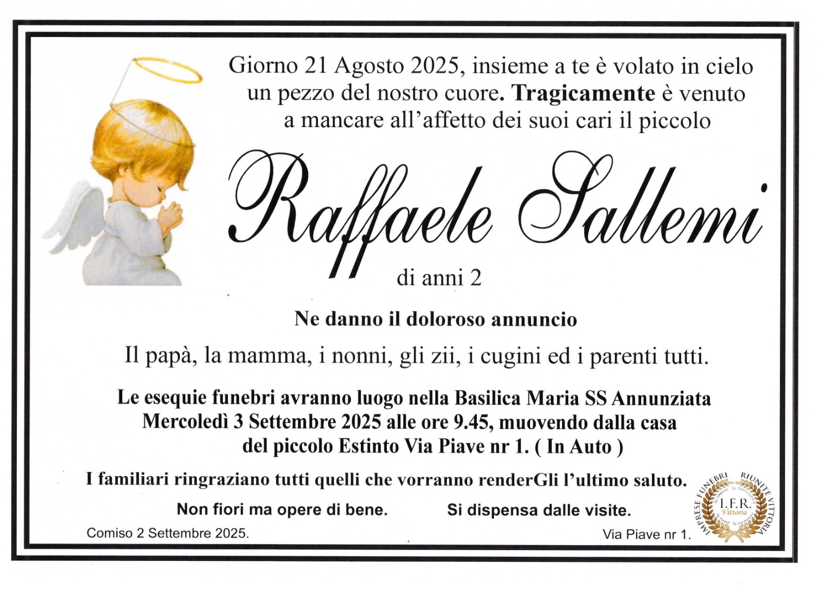 Domani la città di Comiso si stringerà attorno alla famiglia del piccolo Raffaele Sallemi, il bimbo di appena due anni tragicamente scomparso lo scorso 21 agosto a Caucana. Le esequie funebri si terranno alle 10.00 presso la basilica di Maria Santissima Annunziata, dove parenti, amici e l’intera comunità parteciperanno al rito religioso per dare l’ultimo commosso saluto. Il Comune di Comiso, in segno di vicinanza e rispetto, ha proclamato per la giornata di domani il lutto cittadino.