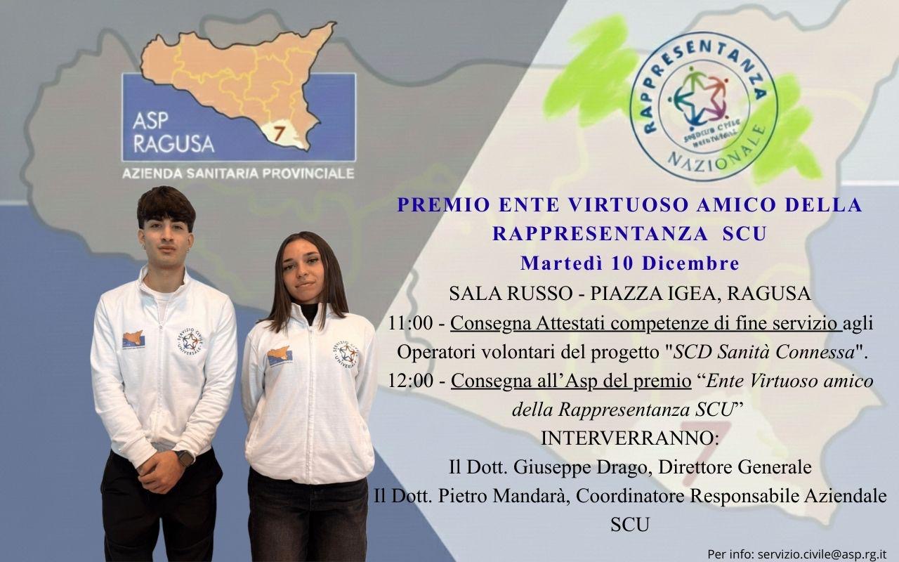 L’ASP di Ragusa è stata individuata tra gli enti destinatari del premio “Ente virtuoso amico della Rappresentanza SCU”, attribuito agli enti che, nel corso del tempo, si sono distinti per la particolare attenzione, sensibilità e collaborazione dimostrata nei confronti della Rappresentanza degli operatori volontari del Servizio Civile Universale. La cerimonia di consegna si terrà mercoledì 10 dicembre alle ore 12 nella sala “Russo-Armenia”, in piazza Igea, alla presenza del Direttore generale Giuseppe Drago.