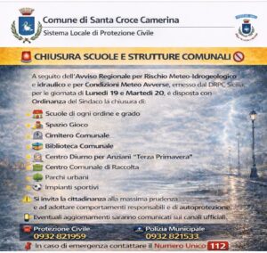 Tutte le scuole della provincia di Ragusa resteranno chiuse lunedì 19 e martedì 20 gennaio 2026. La decisione, presa dai sindaci del territorio, arriva in prevenzione dei fenomeni meteorologici avversi previsti dai bollettini della Protezione Civile, con piogge intense e venti forti.