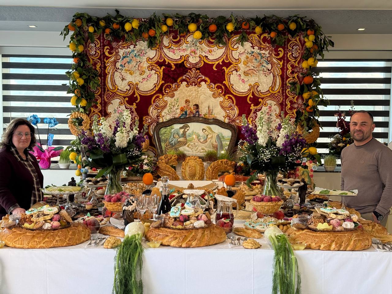 La famiglia Carratello – Aprile ci accoglie in contrada Pezza, dove ha aperto le porte della sua meravigliosa casa per la cena di San Giuseppe per grazia ricevuta. “Una devozione – ci racconta la padrona di casa, Simona – che si è manifestata in famiglia, da quando da piccolini si partecipava tutti alla preparazione del pane intagliato (u Pani pulitu), dei biscotti al latte, di mandorle, per mano delle nonne che iniziavano settimane prima un laborioso lavoro in gruppo, fianco a fianco, instancabilmente”. Oggi è frutto della collaborazione della stessa famiglia Carratello e degli amici che si sono prestati, con gioia, a donare del loro tempo e delle risorse per la buona riuscita della tavolata che è imbandita di ogni ben di Dio: dalle primizie agli ortaggi ai dolci, alle fritture.