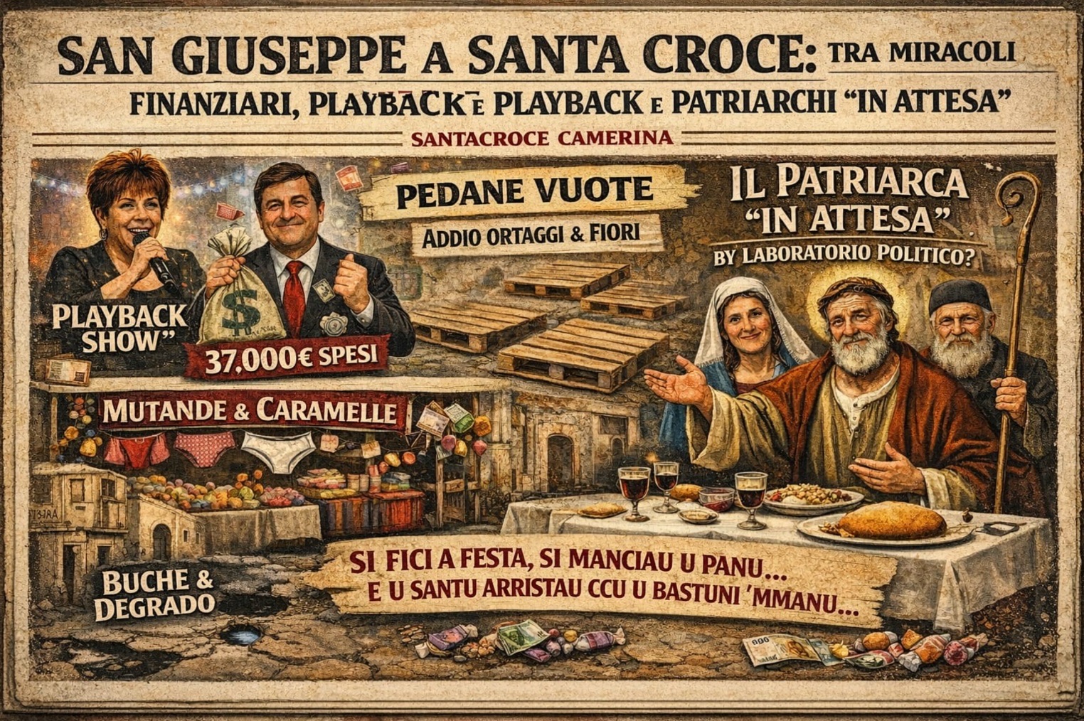 Luci spente, tavole sparecchiate e pance piene (almeno quelle dei figuranti). La festa di San Giuseppe è passata, lasciandoci addosso quel retrogusto di baccalà e polpette mista a perplessità. Un resoconto è d’obbligo, anche perché, tra un “viva Maria” e un “viva il Patriarca”, c’è chi ha fatto i conti senza l’oste e chi ha scambiato il palco per un reparto geriatria.