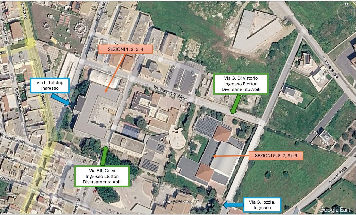 Nel dettaglio, la nuova organizzazione prevede che le sezioni elettorali dalla 1 alla 4 siano allestite presso l’Istituto “Falcone Borsellino”, con accessi da via Tolstoi 4 e da via Fratelli Cervi.