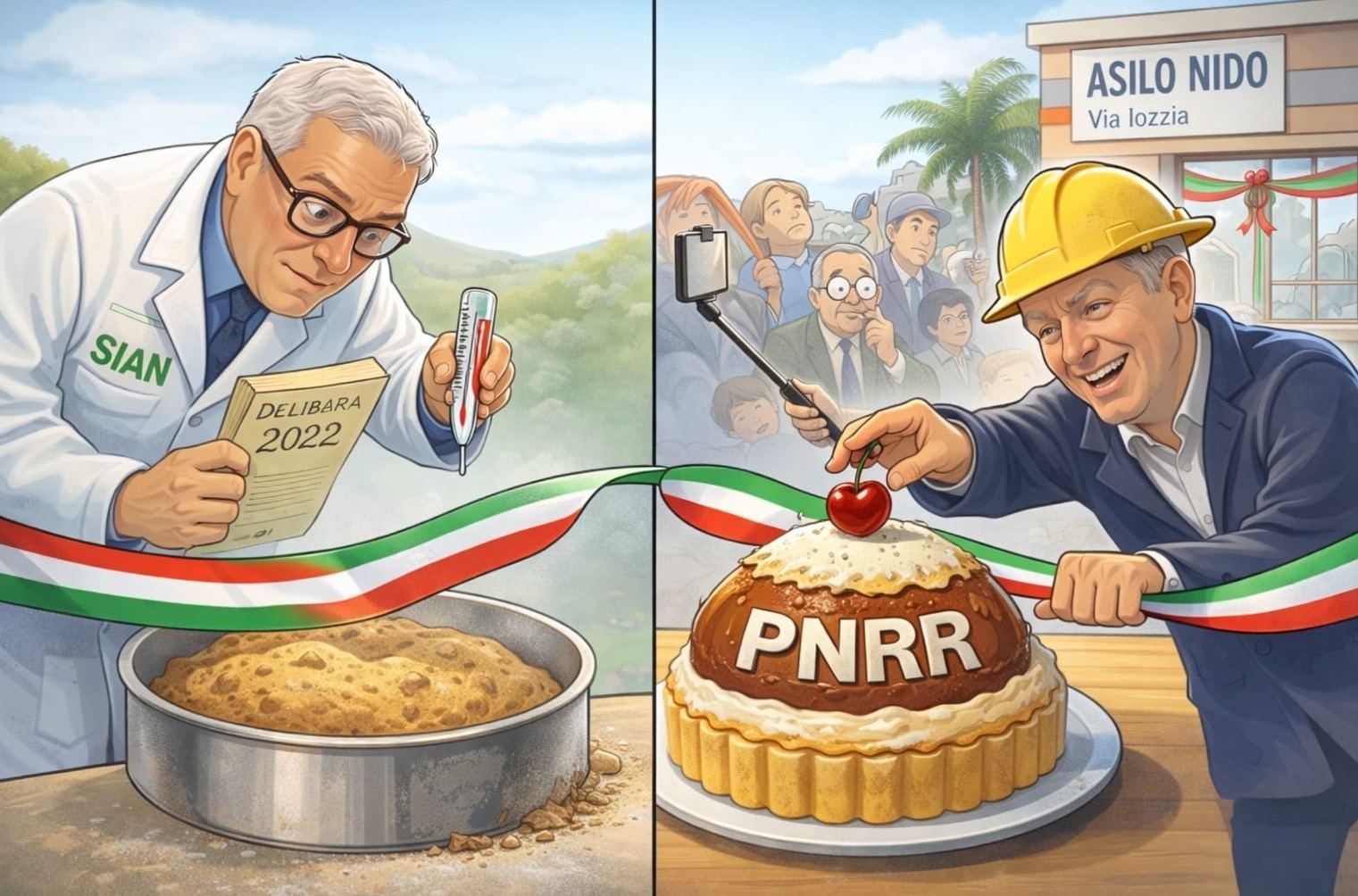 Cari amministratori, il consiglio per la prossima inaugurazione è gratis: fate un bel selfie di famiglia. Barone a sinistra con la delibera del 2022, Dimartino a destra con la forbice d’oro, e in mezzo il PNRR che si domanda: “Ma alla fine, mi volete bene o volete solo i miei like?”.